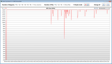 De CPU en GPU verwerken onze stresstest (Prime95 en FurMark draaien minstens een uur) aanvankelijk op respectievelijk 1 tot 2,8 GHz en 800 tot 1.300 MHz. In het verdere verloop van de test dalen de kloksnelheden aanzienlijk tot tussen 500 en 900 MHz (CPU) en 100 MHz (GPU). De stresstest vertegenwoordigt een extreem scenario, en we gebruiken hem om te verifiëren dat het systeem stabiel blijft, zelfs onder volledige belasting