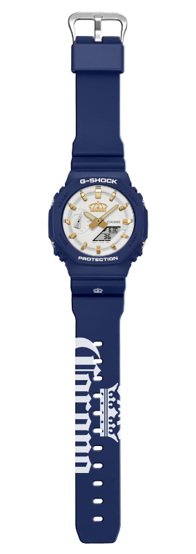 De G-Shock GA-2100CR25-2A heeft een witte wijzerplaat met gouden accenten zoals de indexen en de twee analoge wijzers. Bovendien is het kroonicoon van Corona in goud gedrukt op de wijzerplaat en in wit op de band. Het horloge heeft een blauwe kunsthars lunette, kast en band, met op de laatste ook het logo van het merk in het wit.
