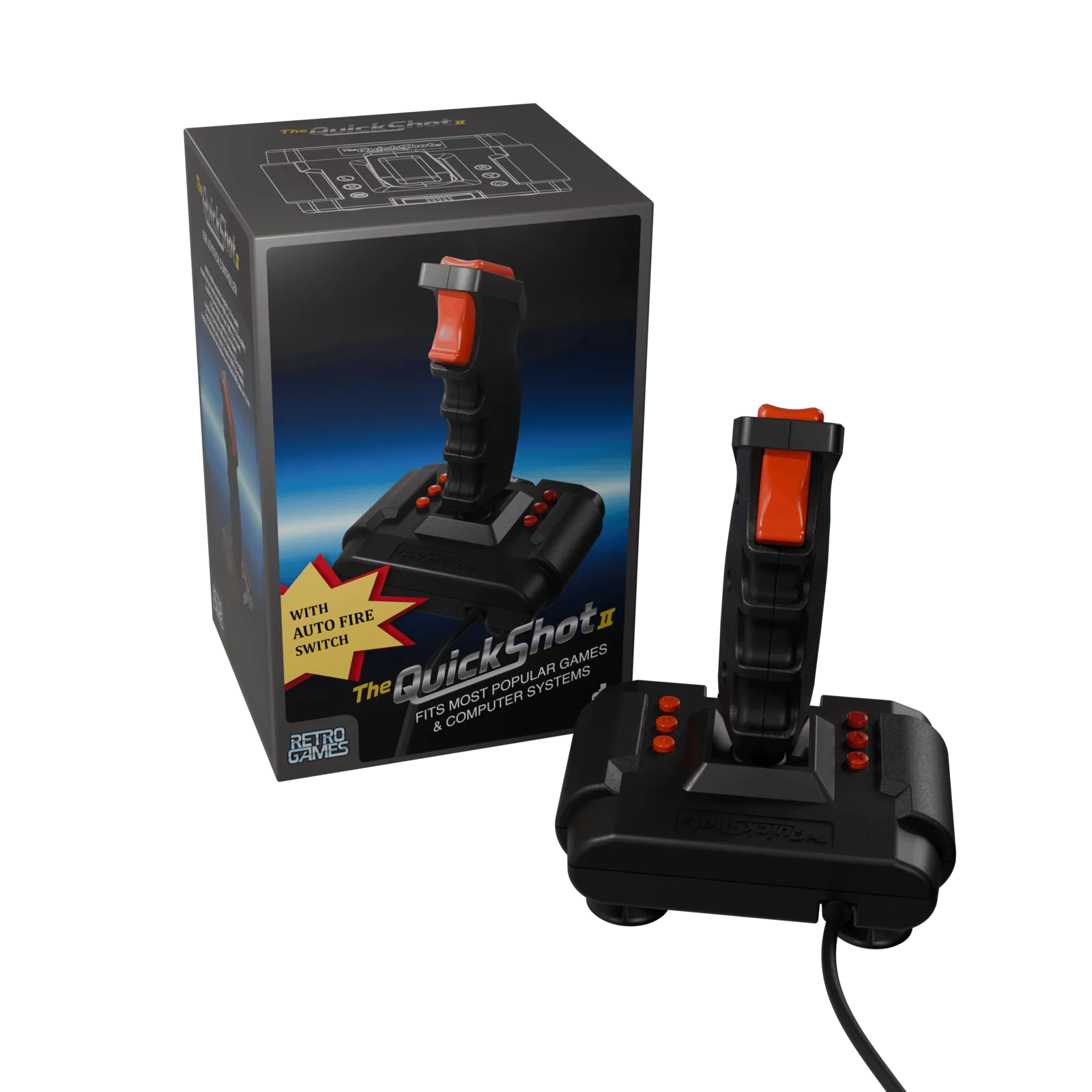 Om bij te blijven met moderne controllers is de vernieuwde Quickshot II voorzien van USB-ondersteuning voor meer gebruiksgemak en wordt er een USB-kabel van 180 cm meegeleverd. Naast PC's en verschillende retro-apparaten werkt de controller ook met de volgende thuiscomputerreplica's van Retro Games: TheC64, The Spectrum, TheA500 en de aankomende TheA1200. De controller kan echter geen verbinding maken met de originele C64 en Commodore Amiga via de 9-pins interface, en biedt ook geen draadloze connectiviteit. Andere opvallende kenmerken zijn de precieze microschakelaars, een kogelgewricht, twee actieknoppen, zes programmeerbare vuurknoppen, een autofire knop en zuignappen.
