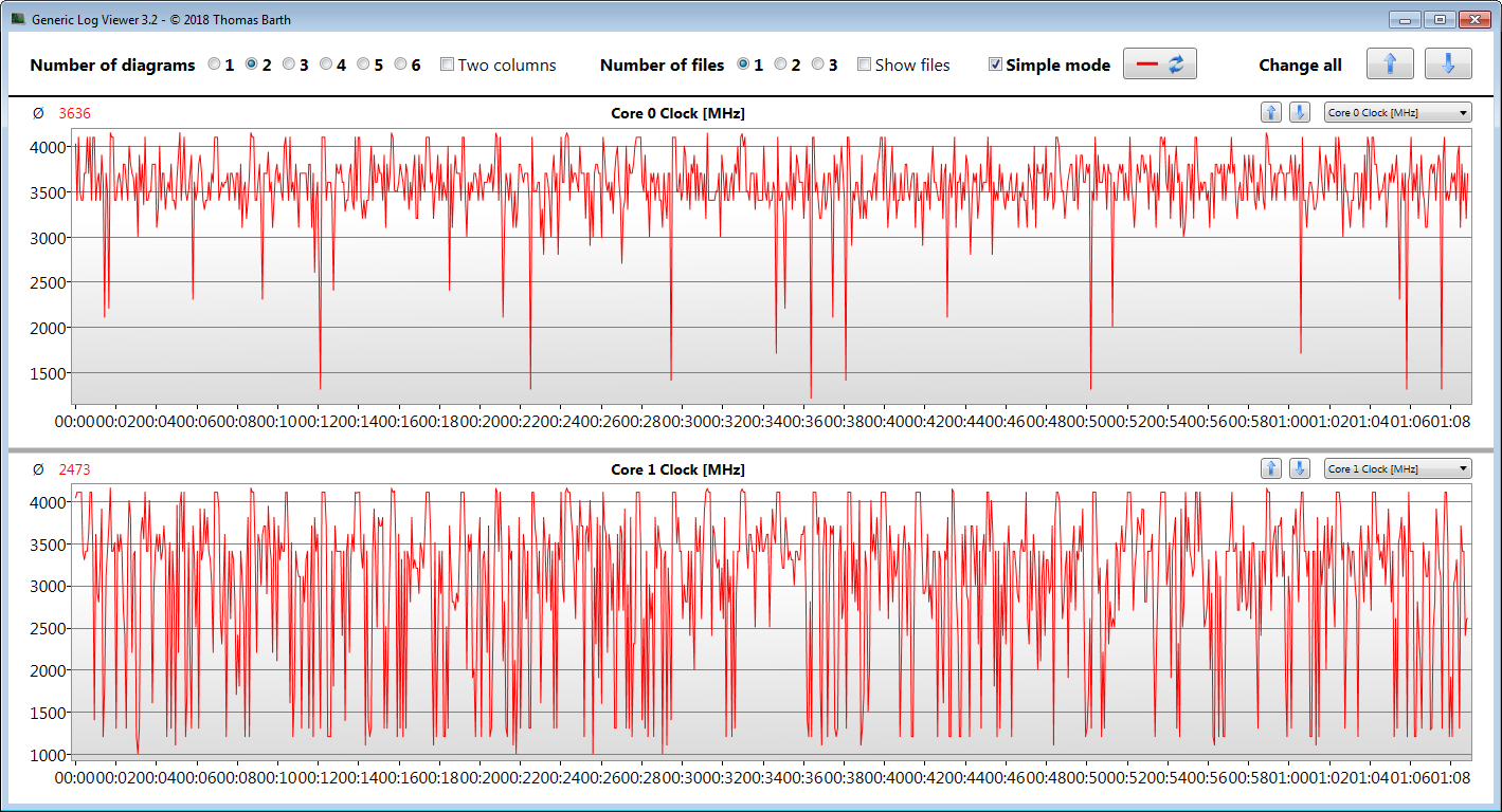 Aan het begin van de stresstest (Prime95 en FurMark lopen minstens een uur), draaien de CPU en GPU gedurende een paar seconden op respectievelijk 3,4 GHz en 1.250 MHz. Daarna dalen de kloksnelheden naar respectievelijk 1 en 1,5 GHz, en 1.000 tot 1.100 MHz, en blijven op dit niveau.