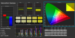 Uit de doos toont het scherm een aanvaardbare kleurweergave - hoewel de kleuren afwijken van het doel. Dit is echter niet echt merkbaar voor de kijker. Het scherm kan de AdobeRGB (40%), sRGB (57%) en DCI-P3 (39%) kleurruimtes niet volledig reproduceren
