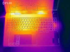 De temperatuurontwikkeling is vergelijkbaar met die van de concurrenten. Een maximum van 46 °C (115 °F) aan de bovenkant en 48 °C (118 °F) aan de onderkant van de kast zijn noch bijzonder hoog, noch bijzonder laag. In rusttoestand blijft de hele behuizing koeler dan 30 °C (86 °F), dus hij is goed geschikt voor comfortabel schrijven of websurfen.