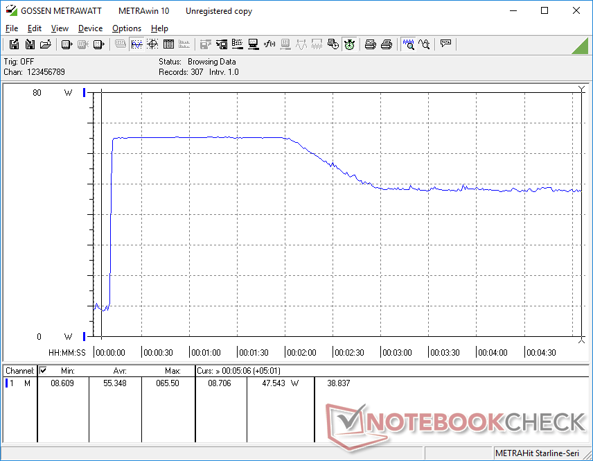 We zijn in staat om een maximaal verbruik van 65,5 W te registreren van de kleine (~11 x 5 x 3 cm) 65 W USB-C adapter wanneer we Prime95 draaien. Dit duurt slechts tijdelijk, zoals blijkt uit onze grafieken hieronder, vanwege de beperkte Turbo duurzaamheid.