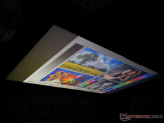 Het beeldscherm hier is misschien wel het grootste aspect dat de IdeaPad serie onderscheidt van de Yoga serie. De visuele kwaliteit is merkbaar slechter op de IdeaPad, zoals blijkt uit de lagere maximale helderheid, smaller gamma, en meer slecht gekalibreerde kleuren. Het werkt goed genoeg voor browsen, e-mailen, en af en toe een spelletje, maar je zult zeker willen kijken naar de duurdere Yoga convertible als fotobewerking, zichtbaarheid buitenshuis en levendigere kleuren een hoge prioriteit hebben. Het aansluiten van een externe monitor met nauwkeurigere kleuren is ook een optie.