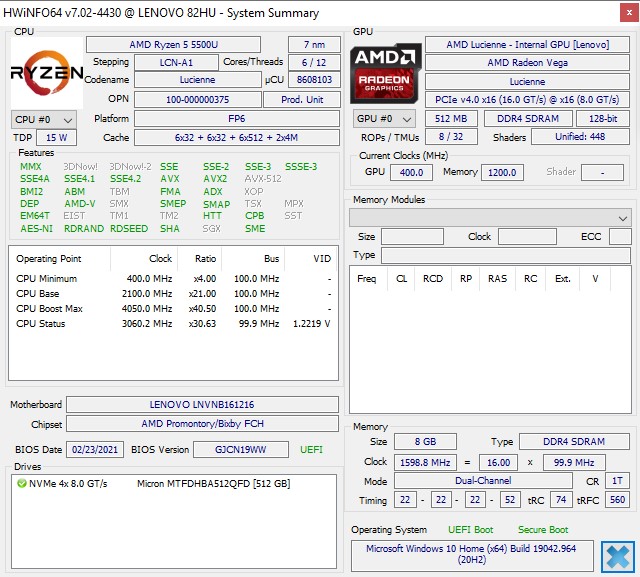| 82.3 % v7 (old) | 05-2021 | Lenovo IdeaPad Flex 5 14ALC05-82HU006NGE R5 5500U, Vega 7 | 1.5 kg | 21.4 mm | 14.00" | 1920x1080 | |