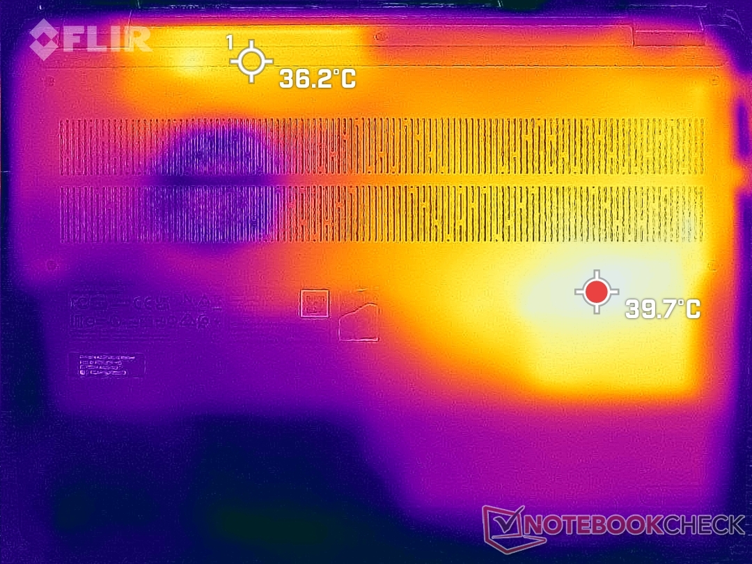 De oppervlaktetemperaturen zijn warmer aan de linkerhelft van de laptop dan aan de rechter, aangezien de CPU en SSD beide aan de linkerkant van het moederbord zijn geplaatst. Hete plekken kunnen oplopen tot 40 C aan de boven- en onderkant bij het draaien van hoge belastingen zoals games, terwijl de rechterkant van de laptop veel koeler zou blijven. Verwacht dat je linker handpalm en vingers warmer zullen zijn dan de rechter, wat enigszins oncomfortabel kan zijn.