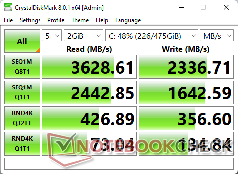Tijdens het uitvoeren van Prime95 om de CPU te belasten, piekten de kloksnelheden en het stroomverbruik op de printplaat tot respectievelijk 3,1 GHz en 97 C, wat ongeveer 20 seconden duurde of totdat de kerntemperatuur 97 C bereikte. De kloksnelheden, het stroomverbruik op de printplaat en de kerntemperatuur stabiliseerden zich uiteindelijk op respectievelijk 2,1 GHz, 26 W en 77 C, vergeleken met 1,0 GHz, 15 W en 69 C op de Vaio FE14 die met dezelfde Core i5-1235U CPU was uitgerust.