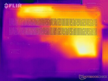 De oppervlaktetemperaturen zijn het warmst aan de linkerkant van de laptop, terwijl de rechterkant veel koeler blijft. Hete plekken kunnen oplopen tot 35 C en 39 C op respectievelijk het toetsenbord en de onderkant, vergeleken met 38 C tot 46 C op de Inspiron 7420 2-in-1. Het systeem wordt nooit onaangenaam warm op de huid wanneer het in tabletmodus wordt vastgehouden.