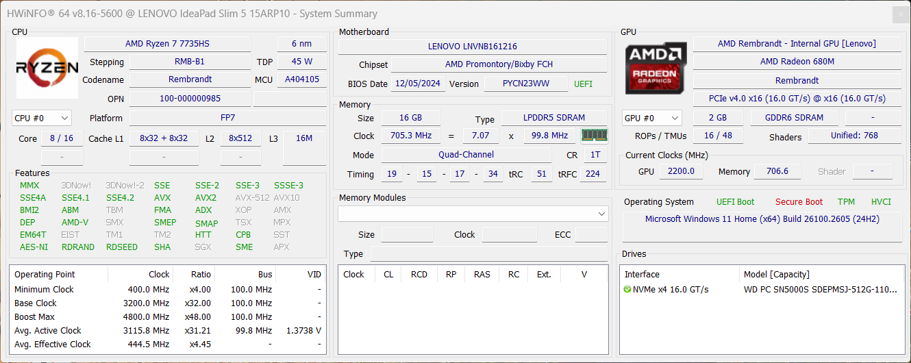 | Lenovo IdeaPad Slim 5-15ARP G10 AMD Ryzen 7 7735HS ⎘ AMD Radeon 680M ⎘ 16 GB Geheugen, 512 GB SSD | Amazon: 1. $589.00 Lenovo IdeaPad Slim 5, 16" W... 2. $596.99 Lenovo IdeaPad Slim 5 Laptop... 3. $599.99 Lenovo IdeaPad Slim 5i Touch... Catalogusprijs: 649€ | 1.6 kg | 15.6 mm | 15.30" 1920x1200 148 PPI IPS | |