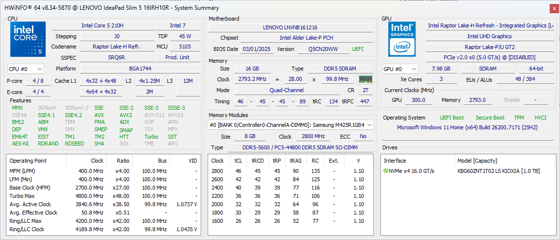 | Lenovo Ideapad Slim 5 16IRH10R Intel Core 5 210H ⎘ Intel UHD Graphics Xe G4 48EUs ⎘ 16 GB Geheugen | Amazon: $749.99 Catalogusprijs: 850 USD | 1.9 kg | 18.4 mm | 16.00" 1920x1200 142 PPI IPS | |