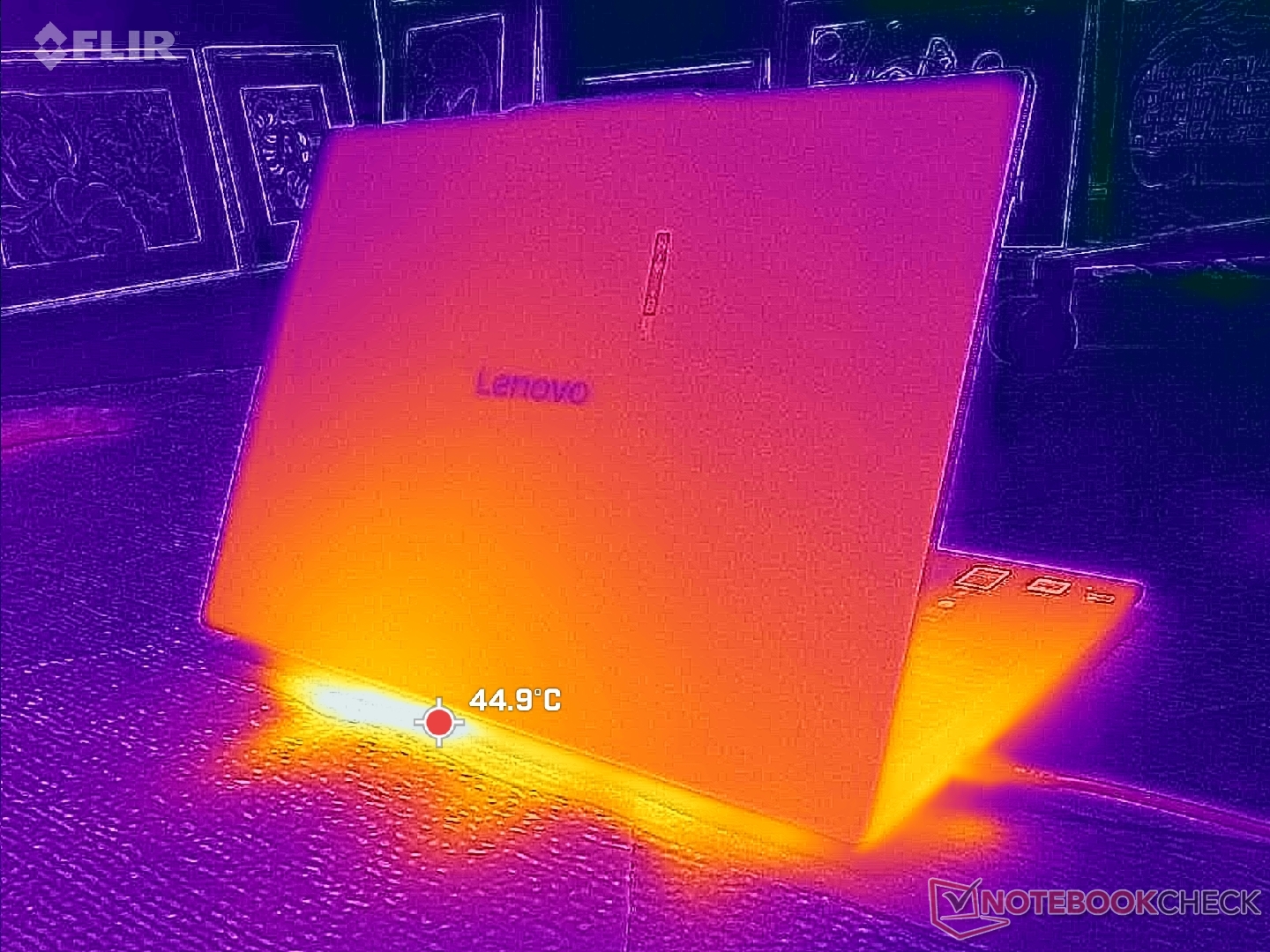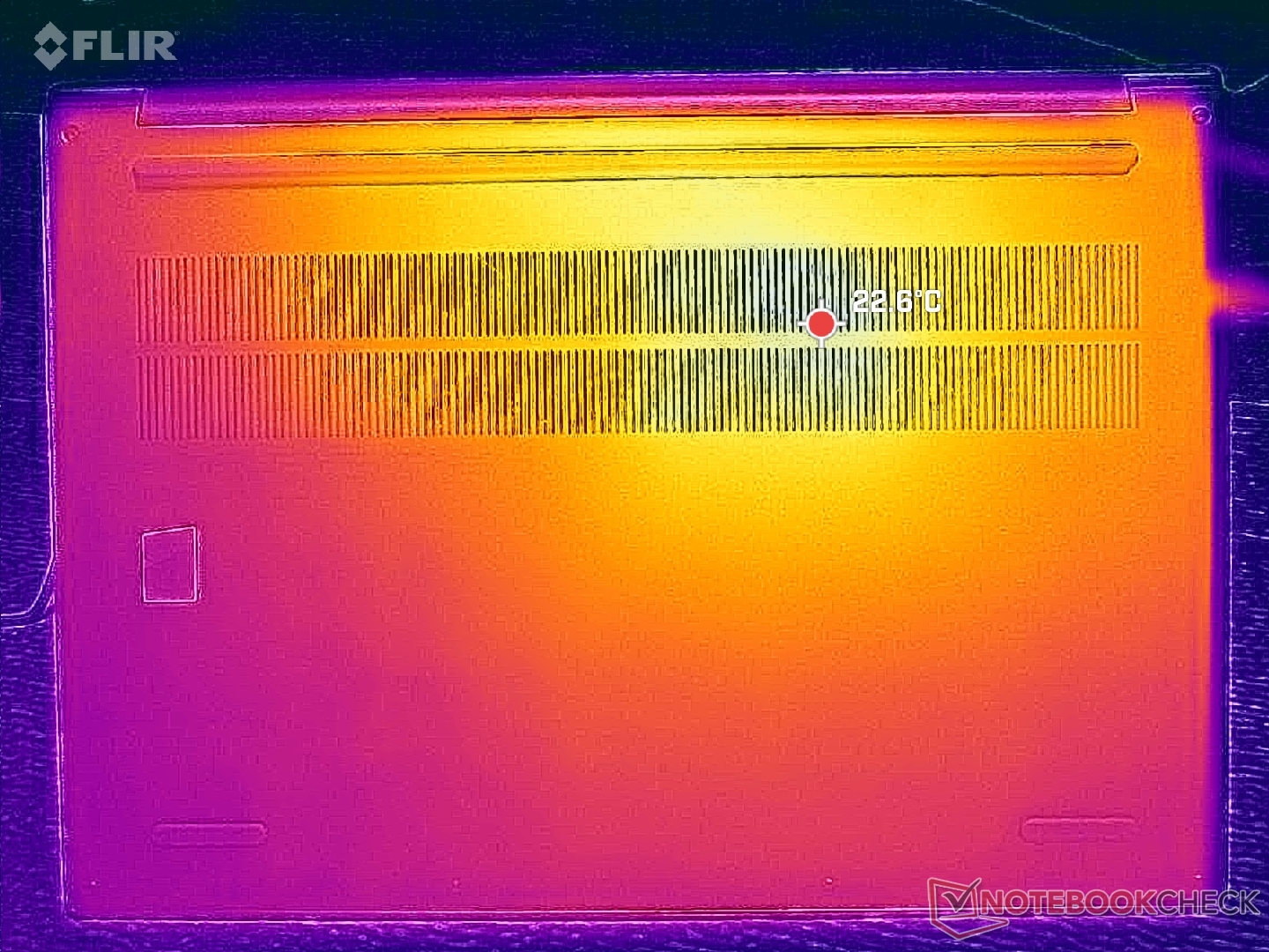 (+) Bij onbelast gebruik bedraagt de gemiddelde temperatuur voor de bovenzijde 24.6 °C / 76 F, vergeleken met het apparaatgemiddelde van 29.5 °C / 85 F.