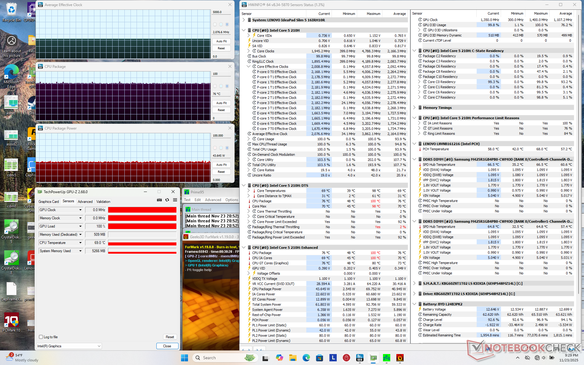 | Prime95 + FurMark Stress | 2.1 | 1350 | 76 |