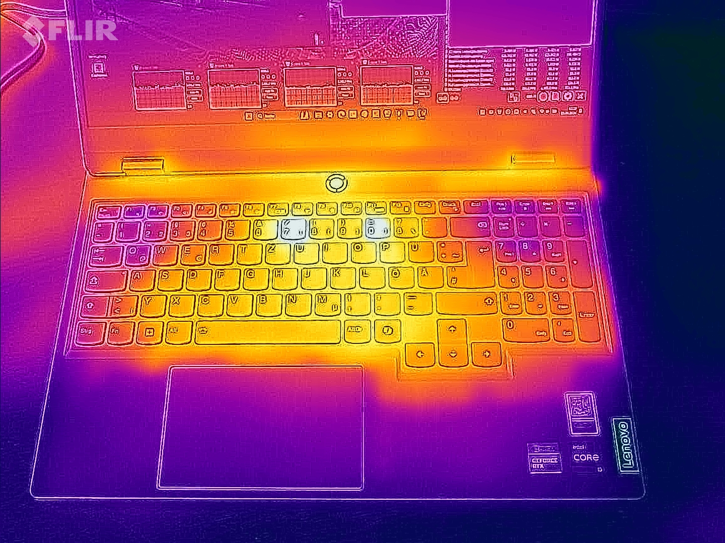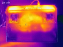 Onder belasting (stresstest, Cyberpunk) wordt de laptop merkbaar warm: Soms overschrijdt hij de grens van 50 graden Celcius. Hij bereikt ook hogere waarden tijdens dagelijks gebruik (kantoor, internet) dan veel van de vergelijkbare apparaten. De temperaturen van de palmsteun blijven redelijk.