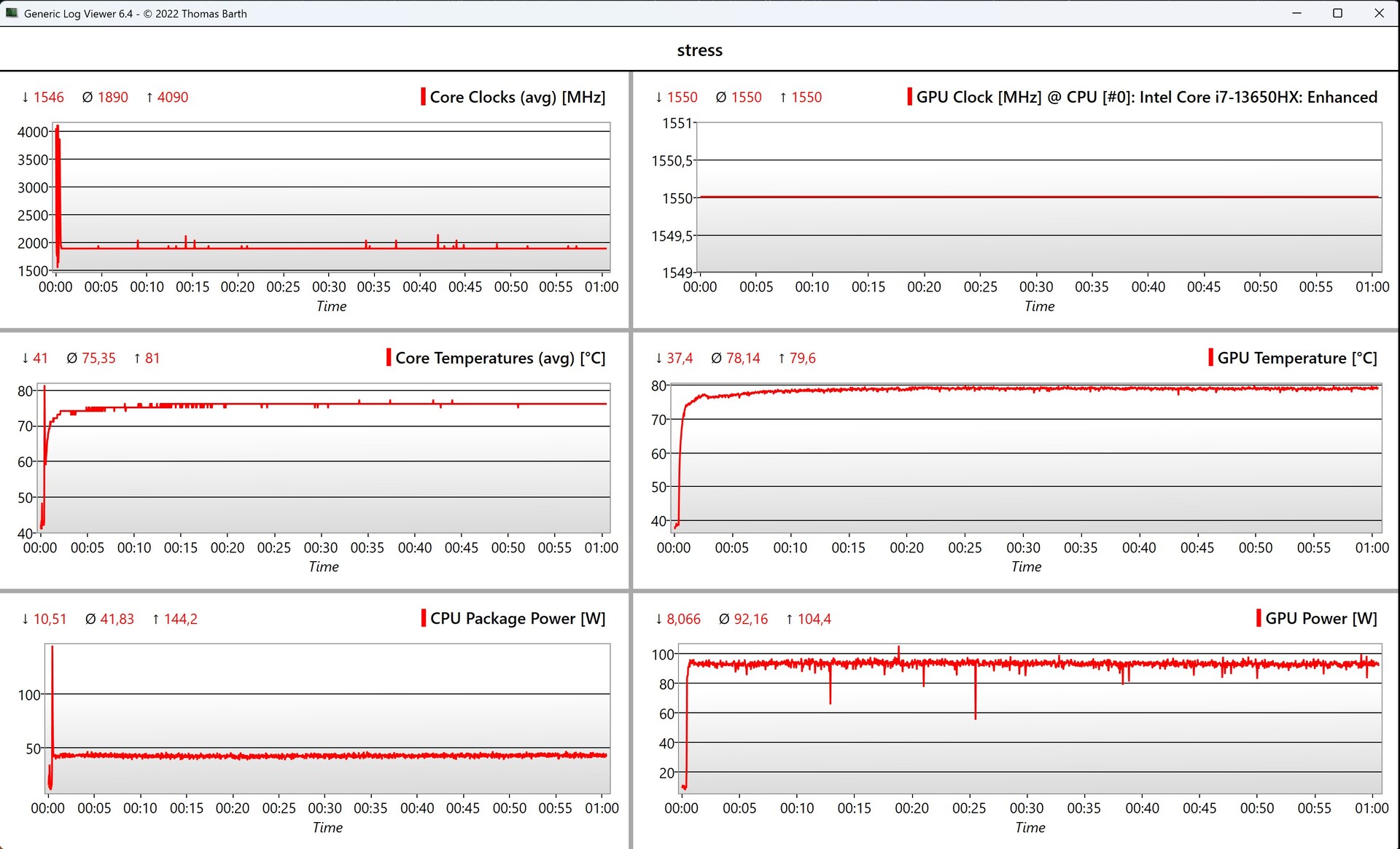 De Intel Core i7-13650HX (Raptor Lake) dient als processor, met vermogenslimieten van 140 en 95 watt - aanzienlijk hoger dan die van de AMD-versie. Over het geheel genomen zijn de CPU-prestaties echter slechts iets beter dan die van de Zen 4 chip. In batterijmodus dalen de CPU-prestaties met ongeveer 40%.