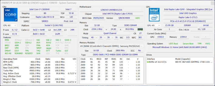 We hebben al een uitgebreide review van de Lenovo Legion 5 15 met de AMD Ryzen 7 260 en de RTX 5060 laptop GPU. Laten we nu eens kijken naar de variant met de Intel Core i7-13650HX in combinatie met de mobiele RTX 5070. In dit artikel richten we ons voornamelijk op de prestaties; voor alle andere details over de behuizing en het OLED-scherm verwijzen we u naar onze review van het AMD-model.