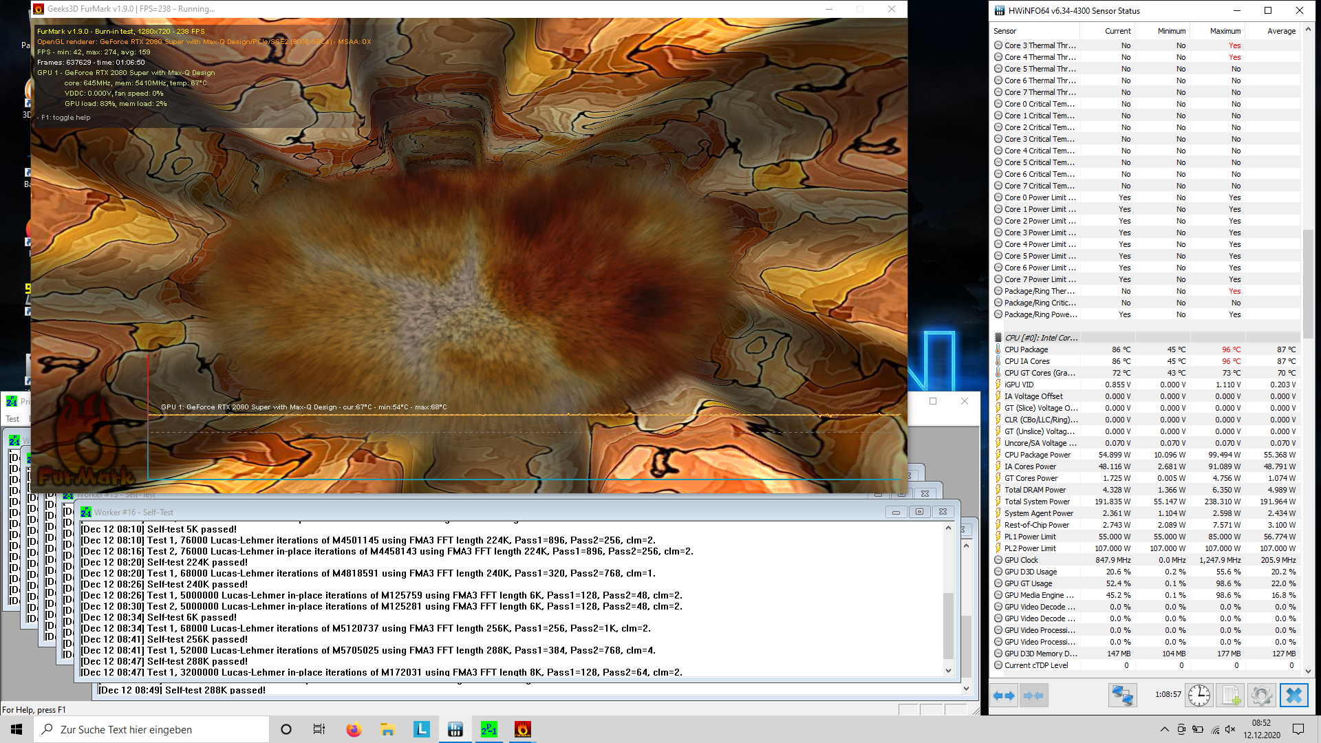 In de stresstest met Prime95 en FurMark springt de CPU-kloksnelheid in eerste instantie naar ongeveer 4,8 GHz en valt dan na korte tijd in het 3,7 tot 3,8 GHz-bereik, voordat hij zich uiteindelijk stabiliseert op ongeveer 2,7 tot 2,8 GHz. De CPU bereikt in eerste instantie een temperatuur van 96 °C (205 °F), maar begint dan te dalen om uiteindelijk af te vlakken bij 86 °C (187 °F). De snelheid gaat niet onder de basiskloksnelheid. In het begin varieert de snelheid van de GPU sterk in het bereik van 1100 tot 1590 MHz, terwijl de kerntemperatuur langzaam stijgt van 65 tot 70 °C (149 tot 158 °F). Naarmate de tijd vordert, verlaagt de GPU zijn snelheid en stabiliseert vervolgens op 1100 tot 1200 MHz - en voor korte perioden daalt de kloksnelheid ook naar lagere waarden
