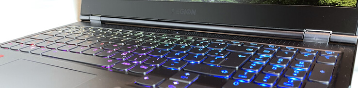 Het chiclet-toetsenbord bevat een cijferblok en gestandaardiseerde pijltjestoetsen. Lenovo heeft de beschikbare ruimte goed benut, zodat het toetsenbord over de hele breedte van de laptop is verspreid. De geïntegreerde RGB-verlichting kan worden bediend via sneltoetsen of via de iCue-software van Corsair, die talrijke door de gebruiker gedefinieerde en vooraf ingestelde verlichtingseffecten biedt. Het toetsenbord heeft een lichte uitstraling en produceert zeer stille typegeluiden.