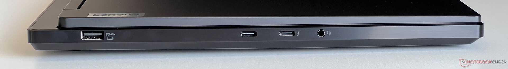De poorten bevinden zich zowel aan de zijkanten als aan de achterkant van de laptop. Op dit gebied doet de normale Legion 7 het iets beter dan de duurdere Legion Pro 7, omdat de koelopeningen zich alleen aan de achterkant bevinden. Alle belangrijke standaarden zijn hier aanwezig, behalve een ethernetpoort en die is niet ideaal voor gamers. De Thunderbolt poort is verbonden via de iGPU en dit betekent dat wanneer u een extern beeldscherm aansluit, de Nvidia GPU niet altijd actief hoeft te zijn. Alle andere video-uitgangen lopen rechtstreeks via de dGPU.