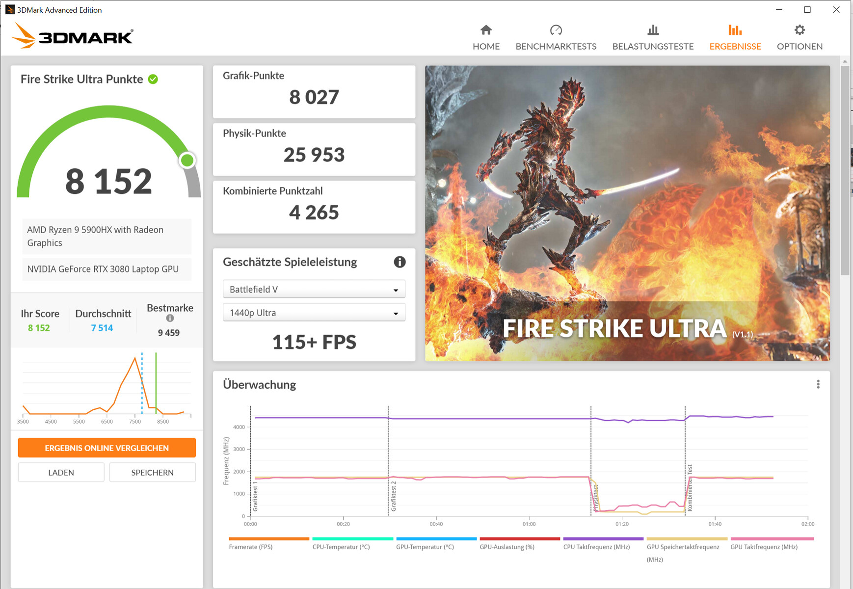 | Lenovo Legion 7 16ACHg6 R9 5900HX, GeForce RTX 3080 Laptop GPU | Asus ROG Zephyrus G15 GA503Q R9 5900HS, GeForce RTX 3080 Laptop GPU | Schenker XMG Pro 15 (Early 2021, RTX 3080) i7-10870H, GeForce RTX 3080 Laptop GPU | Asus Strix Scar 17 G733QSA-XS99 R9 5900HX, GeForce RTX 3080 Laptop GPU | Razer Blade 15 Advanced Model Early 2021 i7-10875H, GeForce RTX 3080 Laptop GPU | Alienware m17 R4 i9-10980HK, GeForce RTX 3080 Laptop GPU | MSI GE76 Raider 10UH i7-10870H, GeForce RTX 3080 Laptop GPU | Gemiddelde van klas Gaming | |