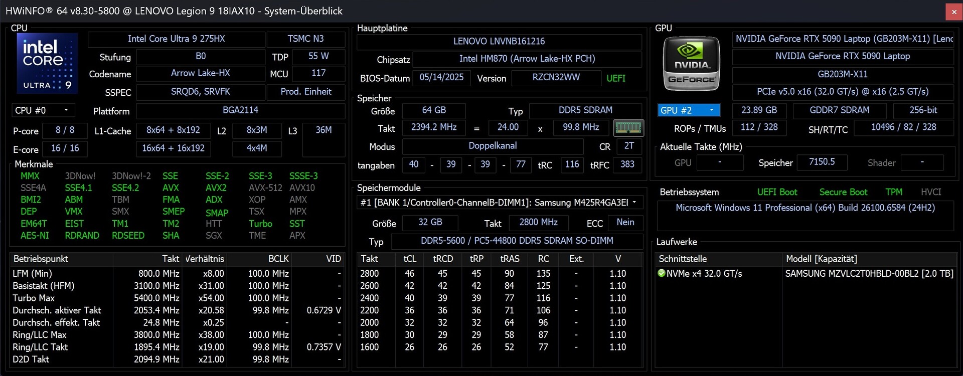 | Lenovo Legion 9 18IAX10 Intel Core Ultra 9 275HX ⎘ Nvidia GeForce RTX 5080 Laptop ⎘ 64 GB Geheugen, 2000 GB SSD | Amazon: $2,749.95 Catalogusprijs: 3800 USD | 3.5 kg | 27.95 mm | 18.00" 3840x2400 252 PPI IPS |