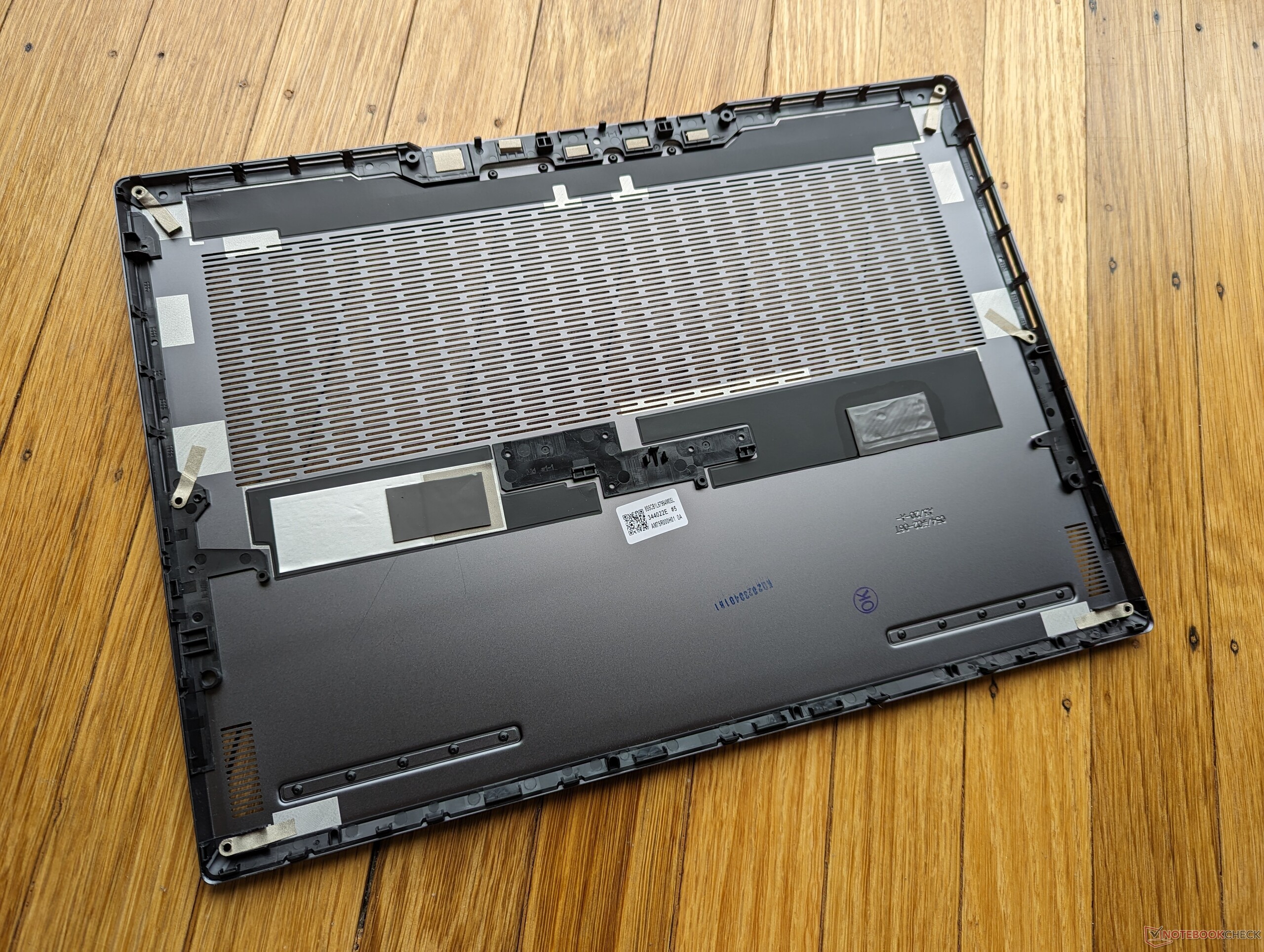 Het onderpaneel wordt vastgezet met acht kruiskopschroeven die eenvoudig te verwijderen zijn. Eigenaars hebben direct toegang tot twee M.2 2280 PCIe4 slots, de WLAN module en de batterij. Het RAM bestaat uit 16 GB gesoldeerd DDR5-5200 plus een uitbreidbaar SODIMM slot onder de aluminium afscherming nabij het midden.