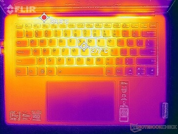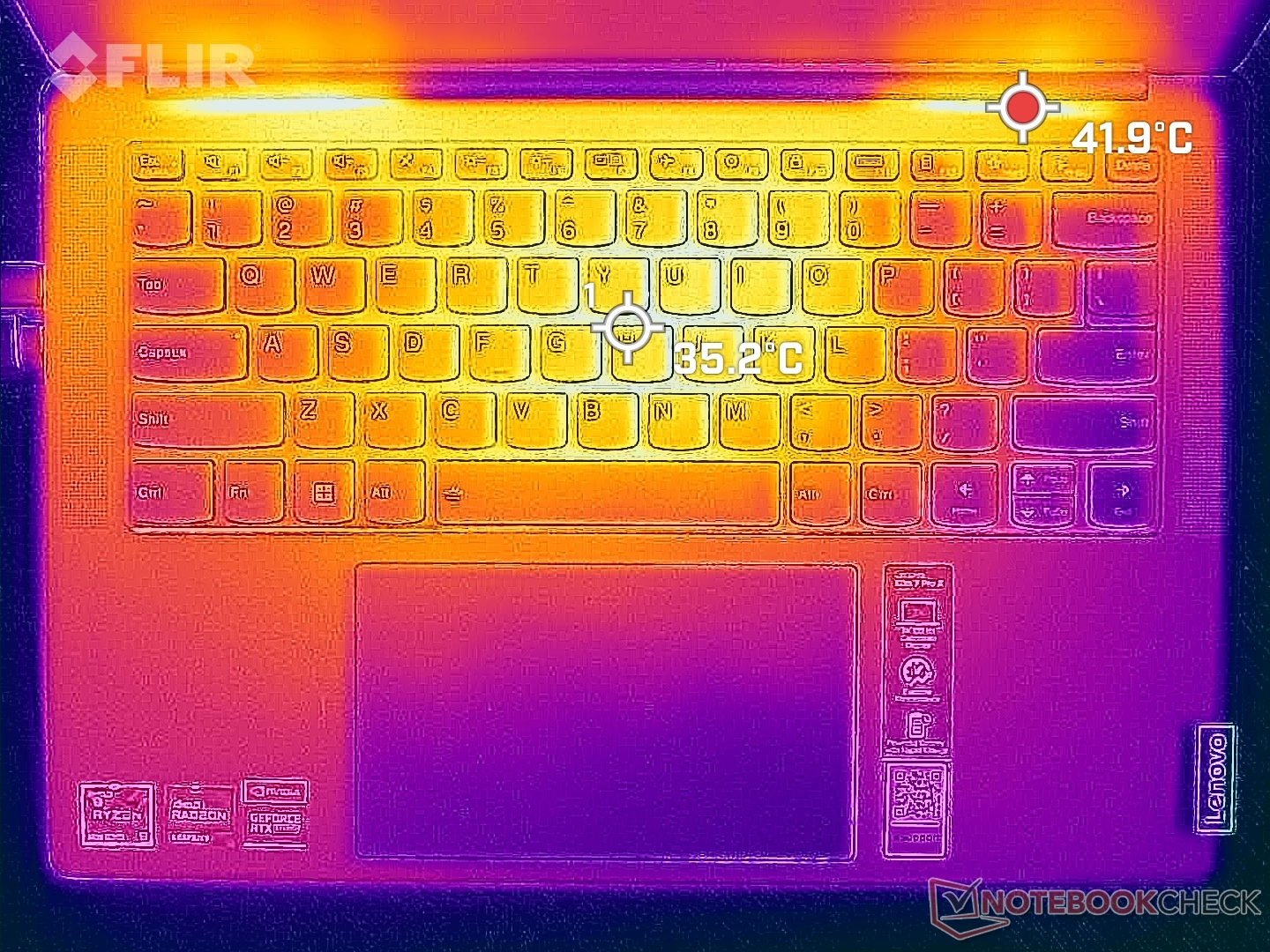 De oppervlaktetemperaturen kunnen behoorlijk hoog oplopen door de combinatie van een dun profiel, H-serie CPU en discrete GeForce RTX GPU. Bij belasting kunnen warme plekken aan de boven- en onderkant oplopen tot respectievelijk 42 C en 50 C, vergeleken met slechts 40 C en 37 C op deDell Inspiron 14 Plus 7420 onder vergelijkbare omstandigheden. De hete plekken op de Lenovo bevinden zich in het midden van het toetsenbord en aan de achterkant van de laptop, waar handpalmen en huid elkaar waarschijnlijk niet lang zullen aanraken.