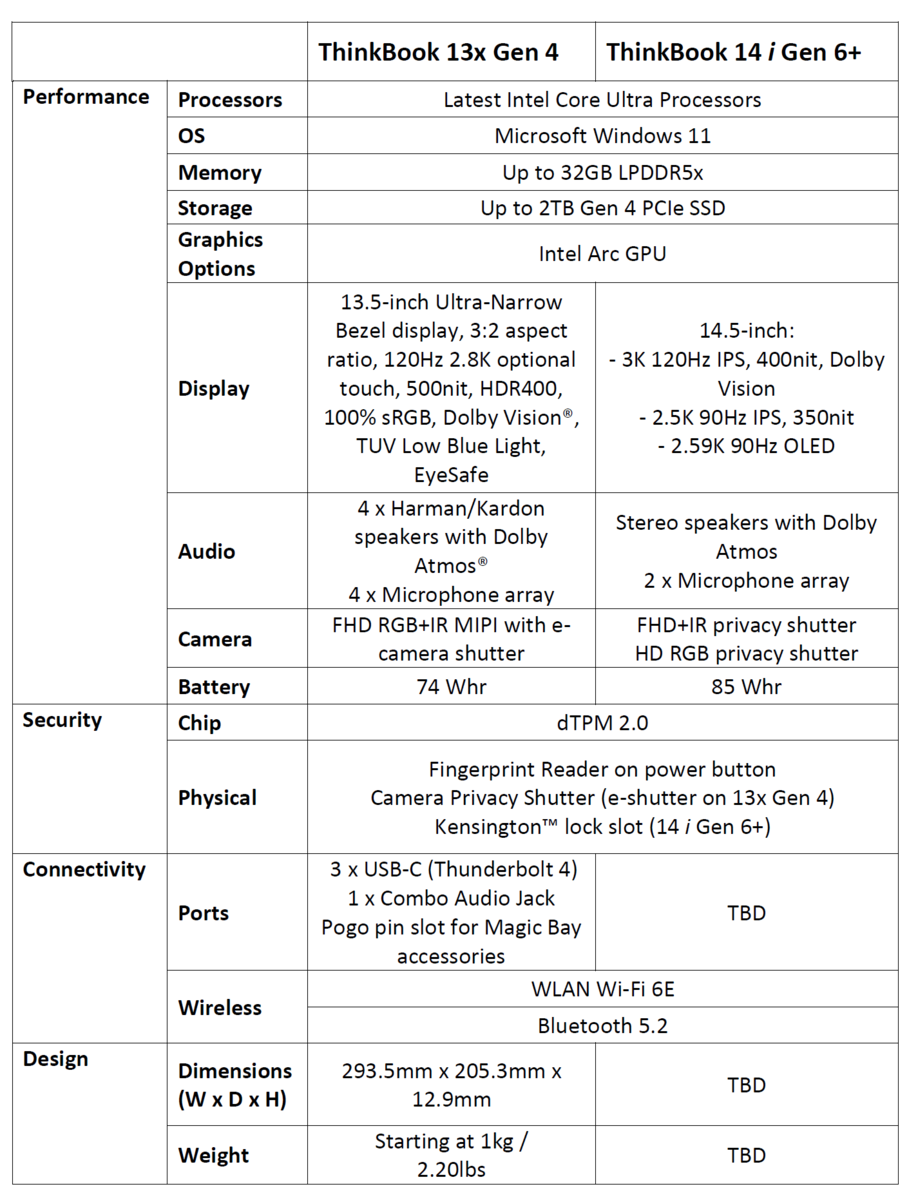 De ThinkBook 13x Gen 4 weegt slechts 1 kg en is slechts 12,9 mm dik. Hij wordt aangedreven door Intel Meteor Lake-processors en kan worden geconfigureerd met maximaal 32 GB LPDDR5x RAM en maximaal een 2 TB PCIe Gen 4 SSD. Lenovo rust de ThinkBook 13x Gen 3 uit met een 13,5-inch 120 Hz 2,8K beeldscherm met 500 nits helderheid, 100% sRGB dekking en Dolby Vision ondersteuning. Kopers kunnen optioneel ook een aanraakscherm configureren.