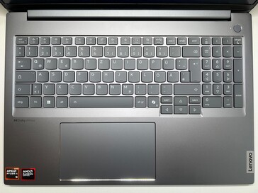 In principe komt het verlichte toetsenbord (ook via een sensor) overeen met het normale ThinkBook 16 G7het typecomfort profiteert echter van de stabielere basiseenheid. De feedback is nauwkeurig en helder, wat betekent dat zelfs langere teksten gemakkelijk te typen zijn. De lay-out heeft speciale toetsen voor pagina omhoog/omlaag, grote pijltoetsen en het speciale numerieke toetsenblok roept geen vragen op. De aan/uit-knop bevindt zich rechts boven het toetsenbord en doet ook dienst als vingerafdrukscanner.