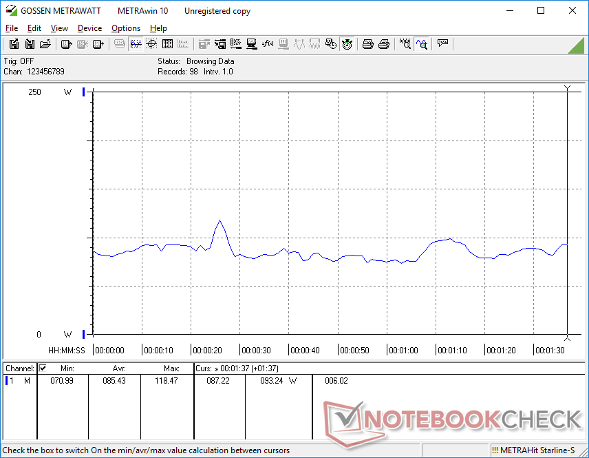 GPU-kloksnelheden, temperatuur en stroomverbruik van de kaart zouden zich stabiliseren op 1582 MHz, 69 C en 69 W bij het uitvoeren van Witcher 3. We komen niet in de buurt van de 90 W TGP doelstelling die het systeem nastreeft, zelfs niet in de Extreme Performance mode.