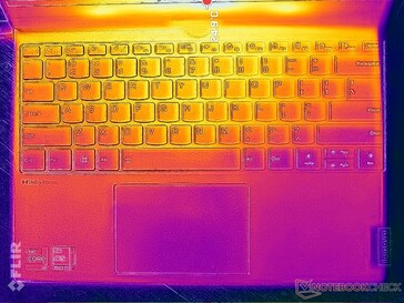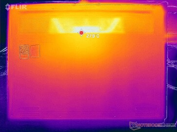 De oppervlaktetemperaturen zijn koeler dan verwacht aan de kant van het toetsenbord, terwijl de onderkant veel warmer kan worden. Hete plekken op het toetsenbord bereiken slechts ongeveer 30 C vergeleken met 39 C aan de onderkant. De warmte is merkbaar maar nooit storend in laptop- of tabletmodus.