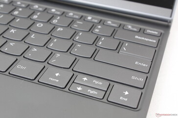Het toetsenbord is een twijfelgeval, omdat het bijna aanvoelt alsof het een ondergeschikte rol heeft gespeeld ten opzichte van de schermen. Meer specifiek zijn de toetsen sponziger dan we gewend zijn, zelfs in vergelijking met andere IdeaPad-modellen. Vooral de spatiebalk is frustrerend, omdat de rechterhelft van de toets bij het indrukken sponziger aanvoelt dan de linkerhelft. Ondertussen zijn de Enter en Backspace toetsen ondieper dan we zouden willen. Lenovo is over het algemeen erg goed als het gaat om toetsenborden op ThinkPads en dus is het een beetje teleurstellend om te zien dat ze de bal laten vallen op de ThinkBook Plus Gen 4.