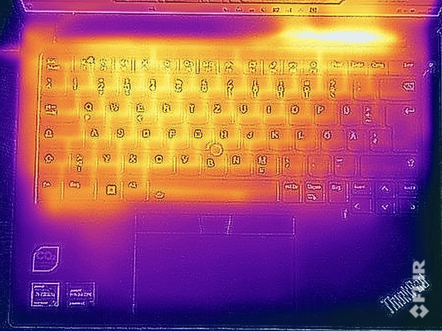 Naast het luide ventilatorgeluid wanneer deze maximaal is, hebben we ook hogere maximumtemperaturen waargenomen in de nieuwe ThinkPad E14 G5. We hebben meer dan 50 °C gemeten aan de onderkant tijdens de stresstest en tijdens het gamen, dus direct huidcontact moet hier worden vermeden. Het toetsenbord blijft veel koeler rond de 40 °C en je kunt zonder problemen blijven typen. Normaal, alledaags kantoorgebruik levert geen beperkingen op. In de stresstest verbruikt de processor een constante 30 watt in de eerste 18 minuten en begint daarna een beetje te schommelen tussen de 25 en 30 watt.