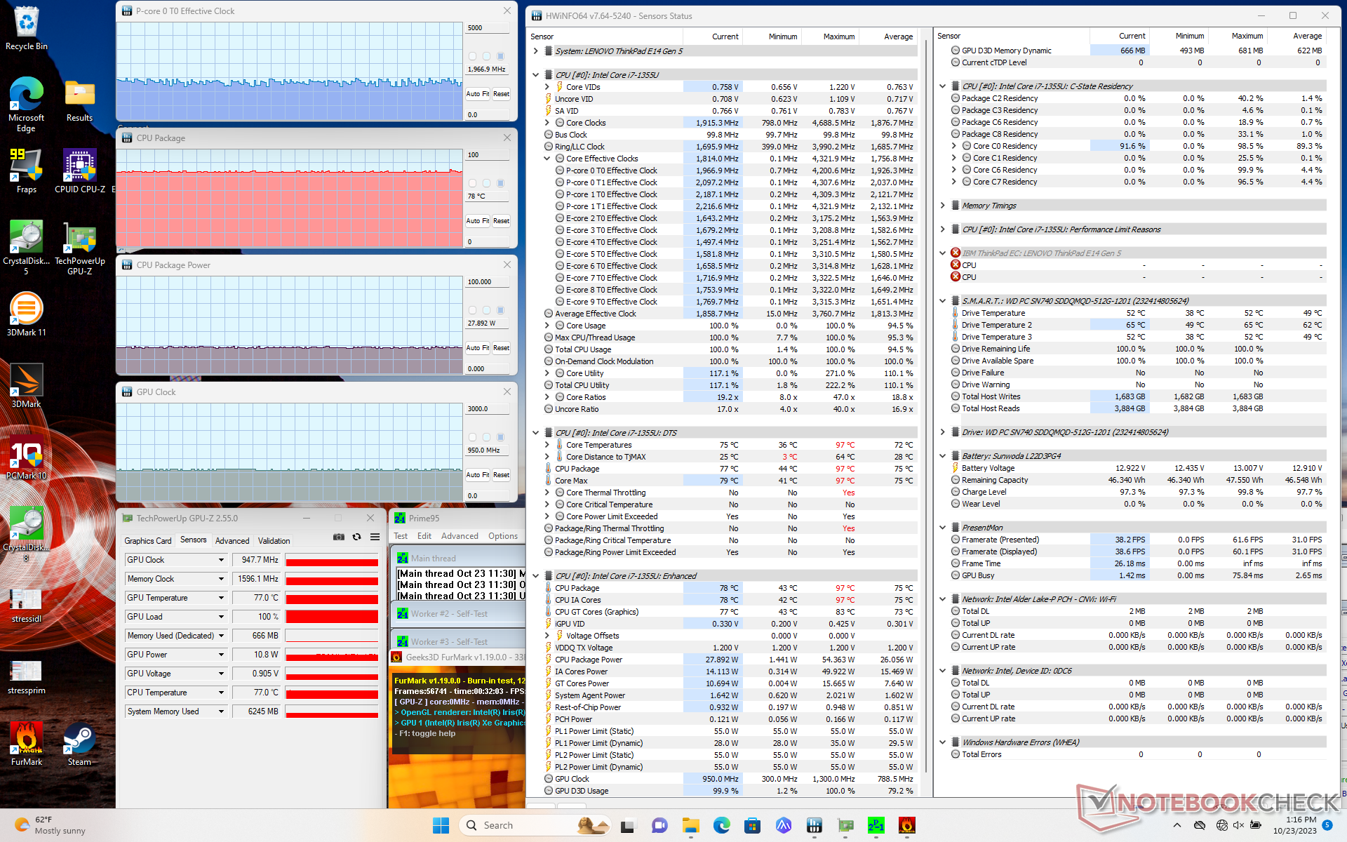 De Intel-gebaseerde ThinkPad E14 G5 vertoont steiler throttling gedrag dan zijn minder dure Ryzen 7 alternatief.