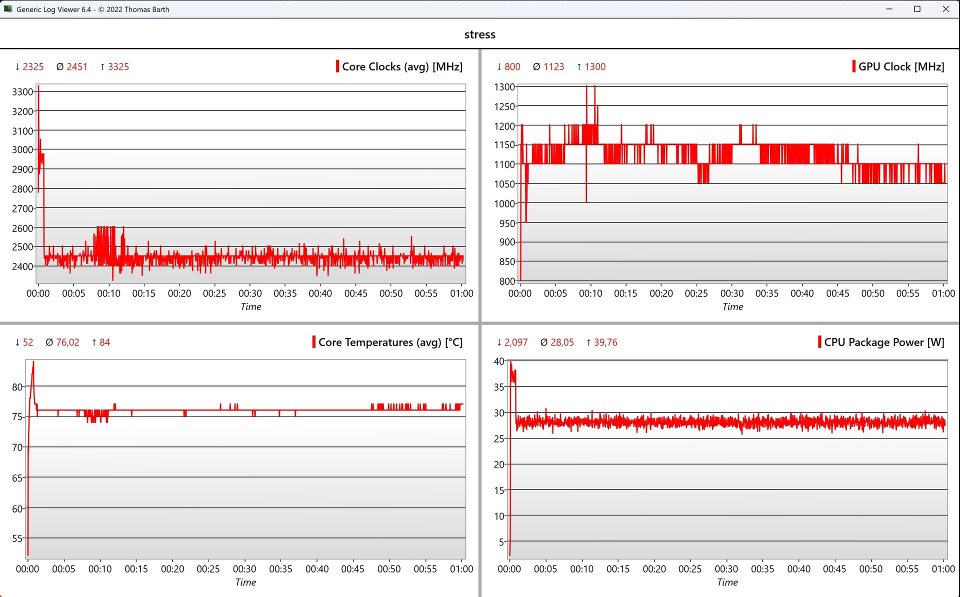 Het Lunar Lake model heeft een voordeel wat betreft stroomverbruik ten opzichte van de Arrow Lake E14. Onder belasting bereikt hij een piek van 61 watt, voordat hij snel terugvalt naar ongeveer 48 watt. De meegeleverde voedingsadapter van 65 watt is daarom meer dan voldoende.