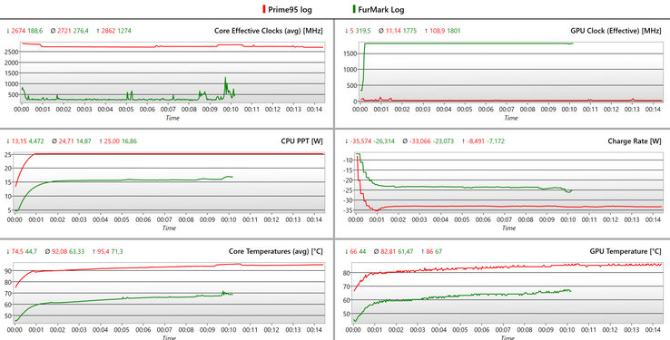 We konden geen gegevens verkrijgen voor onze gecombineerde stresstest (waarbij Prime95 en FurMark tegelijkertijd werden uitgevoerd), omdat het systeem vastliep telkens wanneer we dit probeerden. Dit is op zich al een resultaat en geeft aan dat het systeem stabiliteitsproblemen heeft - iets wat we eerder tegenkwamen toen we probeerden sommige spellen op te starten. De CPU gaf tenminste geen gas toen het systeem de pure CPU-stresstest onderging en draaide op 2,72 GHz, wat nog steeds boven zijn basisklok is.