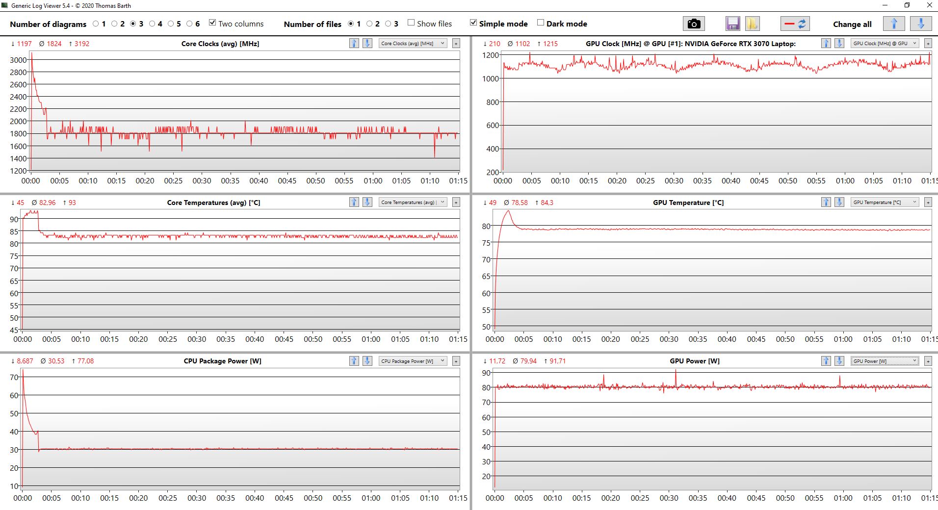 Met de temperatuurmetingen was het al duidelijk dat Lenovo zijn ThinkPad niet ongeremd kan laten presteren in de stresstest. In feite wordt de processor al snel beperkt tot 30 watt wanneer de GPU en CPU tegelijkertijd volledig worden belast, terwijl de GPU-prestaties stabiel blijven op 80 watt.