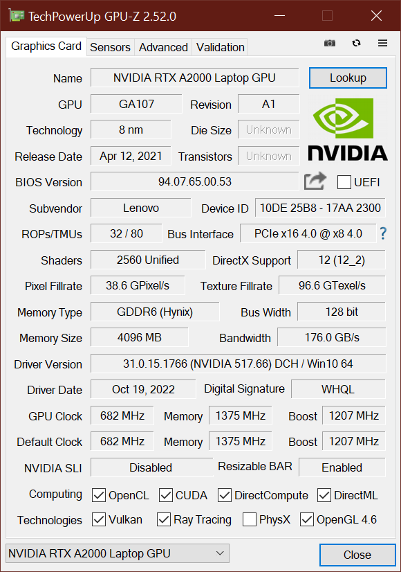 | Lenovo ThinkPad P15v G3 21EM001AGE AMD Ryzen 7 PRO 6850H, NVIDIA RTX A2000 Laptop GPU | Lenovo ThinkPad P16 G1 21D6001DMB Intel Core i7-12850HX, NVIDIA RTX A2000 Laptop GPU | Lenovo ThinkPad P15v G2 21A9000XGE Intel Core i7-11800H, NVIDIA T1200 Laptop GPU | HP ZBook Power 15 G9 6B8C4EA Intel Core i7-12700H, NVIDIA RTX A2000 Laptop GPU | Dell Precision 7670 Intel Core i7-12850HX, NVIDIA RTX A2000 Laptop GPU | |