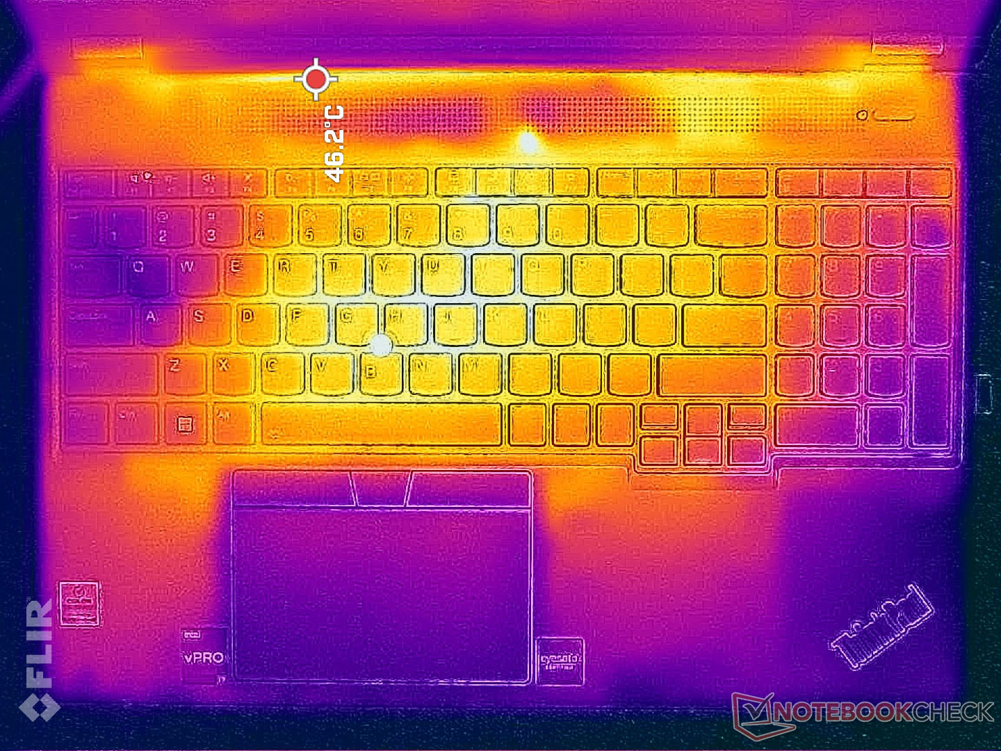 De oppervlaktetemperaturen zijn warmer dan verwacht, zelfs bij stationair draaien op de desktop zonder lopende toepassingen. De onderkant kan bijvoorbeeld wel 37 C warm worden, vergeleken met slechts 31 C op de Precision 7670. Bij hogere belasting kunnen deze zelfde warme plekken op de Lenovo 49 C of warmer bereiken, terwijl het midden van het toetsenbord 40 C kan bereiken. De huidtemperatuur kan oncomfortabel aanvoelen als de laptop op schoot ligt in plaats van op een tafel.