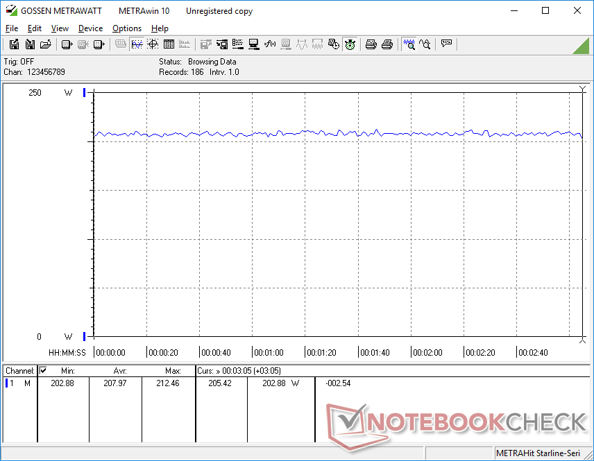 Ten tweede zweet de 230 W AC adapter kogels bij het voeden van een 100+ W CPU en een 130 W GPU. De strijd is merkbaar bij veeleisende belastingen, aangezien de oplaadsnelheid van het systeem aanzienlijk vertraagt of zelfs de batterij begint leeg te lopen in bepaalde scenario's. Als we een piekbelasting van 285 W kunnen meten met een AC-adapter van slechts 230 W, dan is er duidelijk sprake van een knelpunt. Een grotere 280 W of 330 W AC-adapter zou meer geschikt zijn geweest gezien ons configuratieniveau.