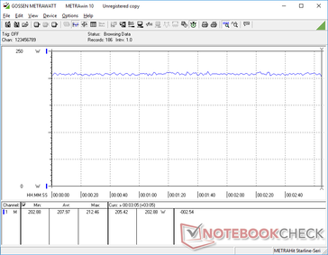 Het stroomverbruik bij stationair draaien is enkele watt lager dan op de Precision 7670, waarschijnlijk vanwege het zwaardere OLED-paneel op laatstgenoemde. Bij hogere belastingen zoals Witcher 3wordt het verbruik op de Lenovo echter merkbaar hoger dan op de Dell (208 W vs. 159 W). Het hogere stroomverbruik valt samen met de snellere CPU en GPU prestaties ten opzichte van het concurrerende Dell model, zoals blijkt uit onze benchmarks hierboven.