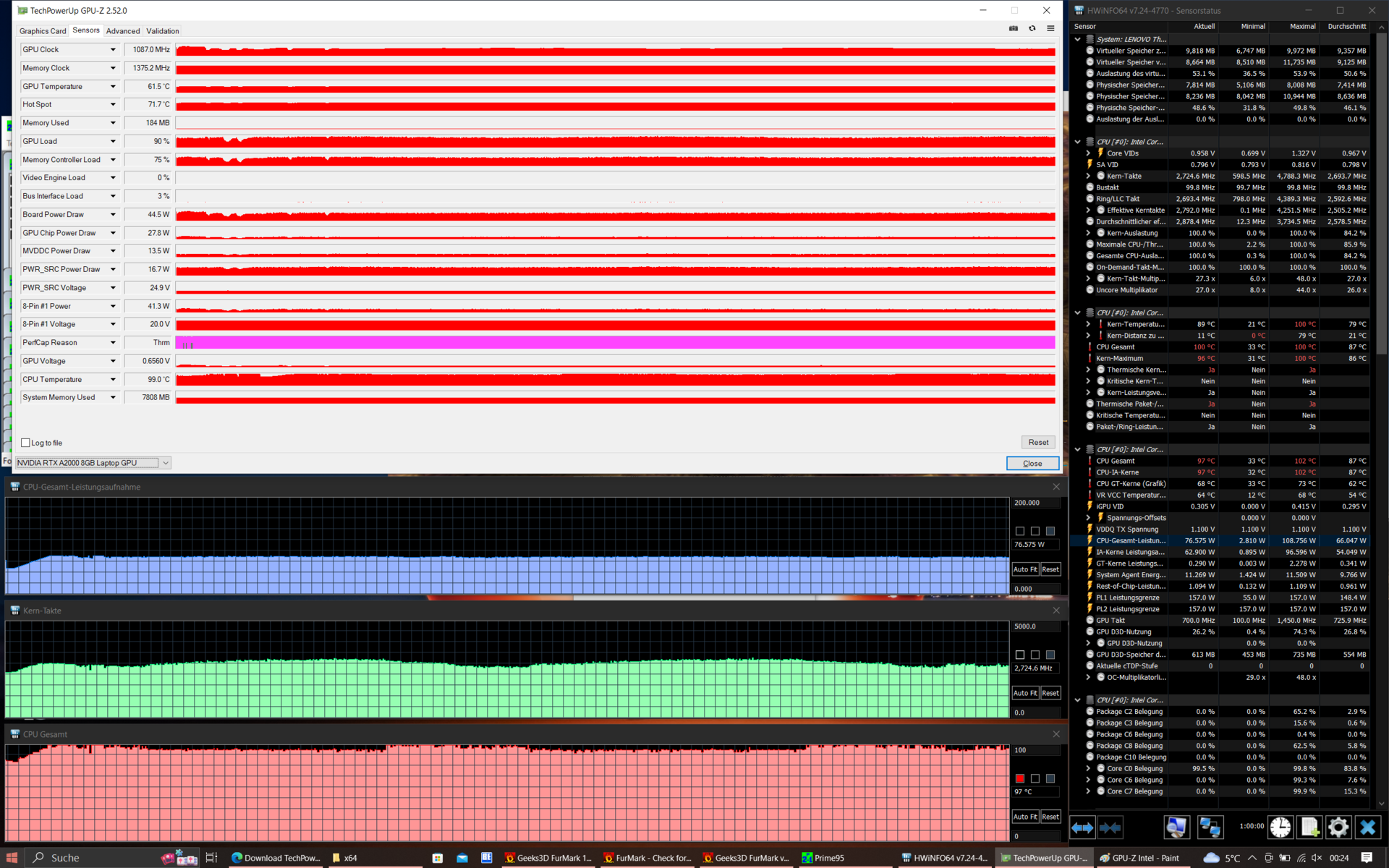 Hoewel de processor niet werd afgeremd tijdens de stresstest, daalden de GPU-prestaties: Na een uur kan deze nog maar 45 watt verbruiken in plaats van 60.