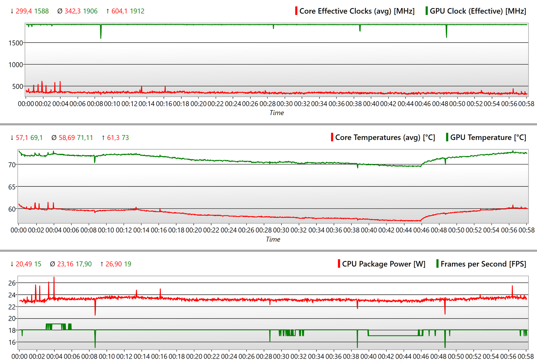 Tijdens pure CPU-stress wordt de basiskloksnelheid met 200 MHz overschreden, en tijdens pure GPU-stress draait de Radeon iGPU op zijn volle snelheid van ~1.900 MHz.