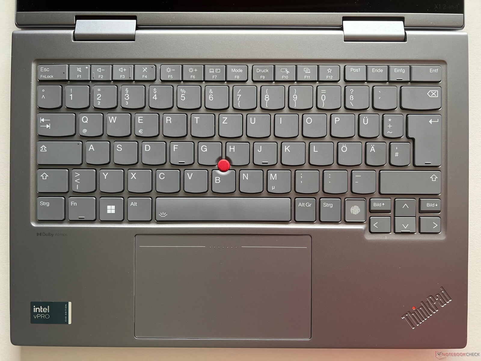 Het toetsenbord van de ThinkPad X1 2in1 G9 heeft nog steeds een toetslift van 1,5 mm en voelt over het algemeen comfortabel aan om op te typen, hoewel de kwaliteit niet meer kan wedijveren met de toetslift van de oude modellen - wat ons altijd opvalt in vergelijking met onze ThinkPad X1 Carbon uit 2018. Bovendien heeft de ThinkPad hier geen voordeel meer ten opzichte van zijn concurrenten. Een knop voor de vingerafdrukscanner is nieuw op het toetsenbord, maar u zult het zonder de nieuwe Copilot-toets moeten stellen. Het is ook vervelend dat de achtergrondverlichting van het toetsenbord met twee niveaus niet automatisch kan worden geactiveerd.