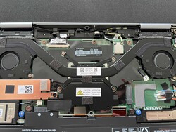 Het onderste deksel van de behuizing zit vast met gewone Philips-schroeven en kan vrij gemakkelijk worden verwijderd. Binnenin kunt u de ventilatoren schoonmaken en indien nodig de batterij of de M.2 2280 SSD verwisselen. Er kan ook een WWAN-module worden geïnstalleerd, terwijl het RAM en de WLAN-module zijn vastgesoldeerd.