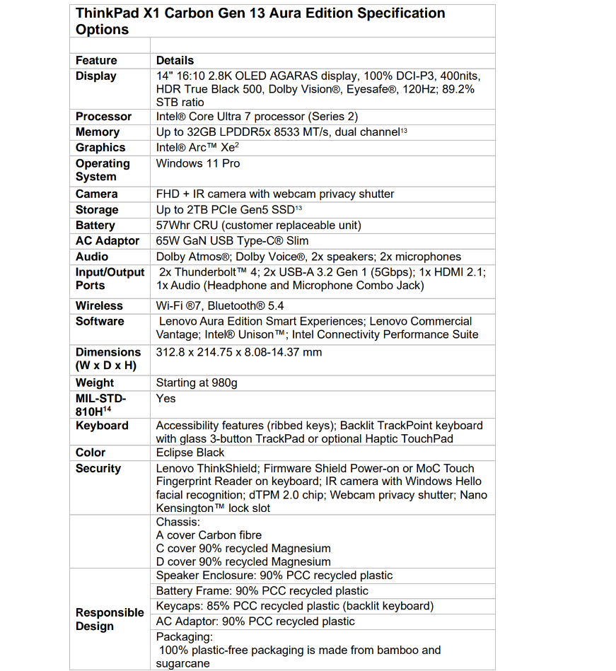 Lenovo ThinkPad X1 Carbon Gen 13 Aura Edition: Prijzen en beschikbaarheid