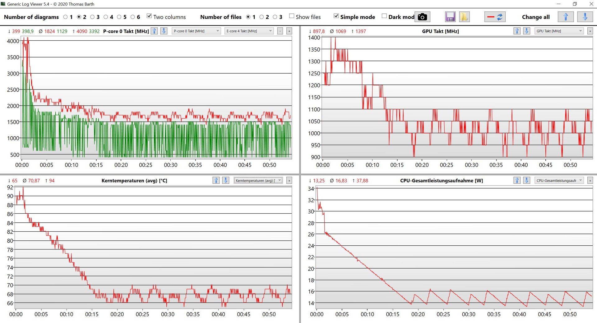 In de stresstest is het patroon in principe hetzelfde als bij pure CPU belasting, maar na een paar minuten begint het energieverbruik van de processor verder te dalen en bereikt na 20 minuten een waarde van slechts 18 watt. Vanaf hier wordt het ventilatorgeluid ook iets stiller, wat een beetje verrassend is omdat devoorgangernog steeds in staat was om een stabiel verbruik van 25 watt aan te houden. Vooral de GPU klok schommelt wild bij 18 watt, dus we gaan ervan uit dat er in de komende weken/maanden enkele BIOS updates zullen volgen.