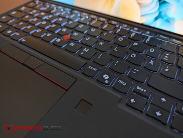 Het touchpad meet ongeveer 10 x 5,5 cm, met de drie speciale toetsen erboven en het ThinkPad-typische rode trackpoint op het toetsenbord. Rechts van het touchpad is een kleine vingerafdruksensor voor Windows Hello geïntegreerd, wat in 2021 al het geval was.