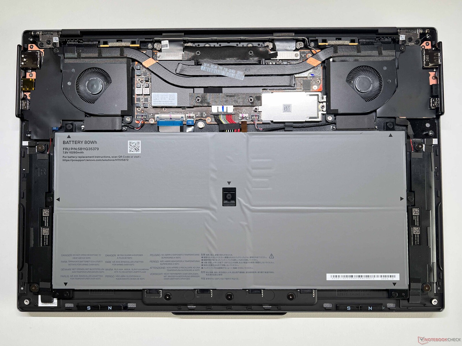 Lenovo levert een handleiding voor hardwareonderhoud voor de ThinkPad X9 en de onderklep wordt vastgezet met gewone Philips-schroeven (let op: draai de schroeven alleen los, niet met kracht verwijderen). De grote 80 Wh batterij domineert de interne lay-out met alle belangrijke componenten in het bovenste gedeelte waar het chassis dikker is. Zowel de M.2-2242 SSD als de batterij kunnen indien nodig worden vervangen, maar alle andere componenten bevinden zich aan boord.