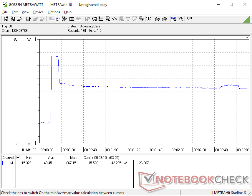 We zijn in staat om een maximale trek van 67 W te meten van de kleine (5,6 x 5,6 x 2,9 cm) 65 W USB-C AC adapter. Dit percentage is slechts tijdelijk voordat het daalt met maar liefst 25 W, zoals hieronder getoond, als gevolg van de beperkte Turbo Boost mogelijkheden van het systeem.