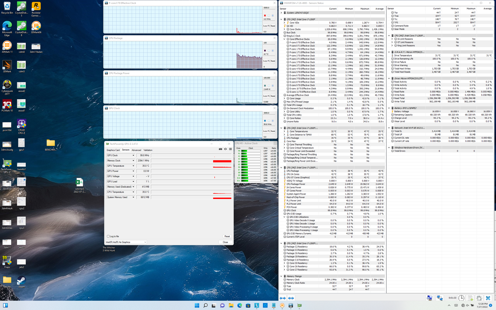 GPU kloksnelheden en temperatuur zouden stabiliseren op respectievelijk 998 MHz en 67 C, wanneer Witcher 3 op de Extreme Prestaties modus. Het herhalen van dezelfde test in de Intelligent Cooling modus zou resulteren in iets lagere CPU en GPU kloksnelheden en koelere kerntemperaturen, zoals blijkt uit de onderstaande tabel. Het uitvoeren van dezelfde test op de Dell Inspiron 16 7620 2-in-1 zou resulteren in hogere GPU kloksnelheden en temperaturen van respectievelijk 1296 MHz en 82 C. De relatief lagere kerntemperaturen van de Lenovo kunnen verantwoordelijk zijn voor de koelere oppervlaktetemperaturen zoals hierboven vermeld.
